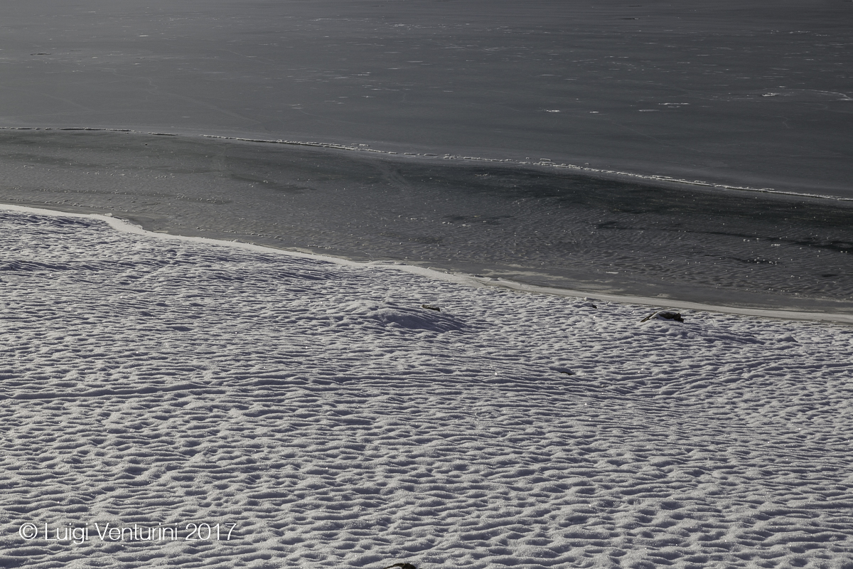Le linee elettriche ad alta tensione che affiancano il lago generano un crepitio fastidioso che dopo un po’ le nostre orecchie non sentono più, si abituano e l’ignorano, ma il ghiaccio emette suoni cupi a bassa frequenza che sentiamo quasi più con lo stomaco che con le orecchie.