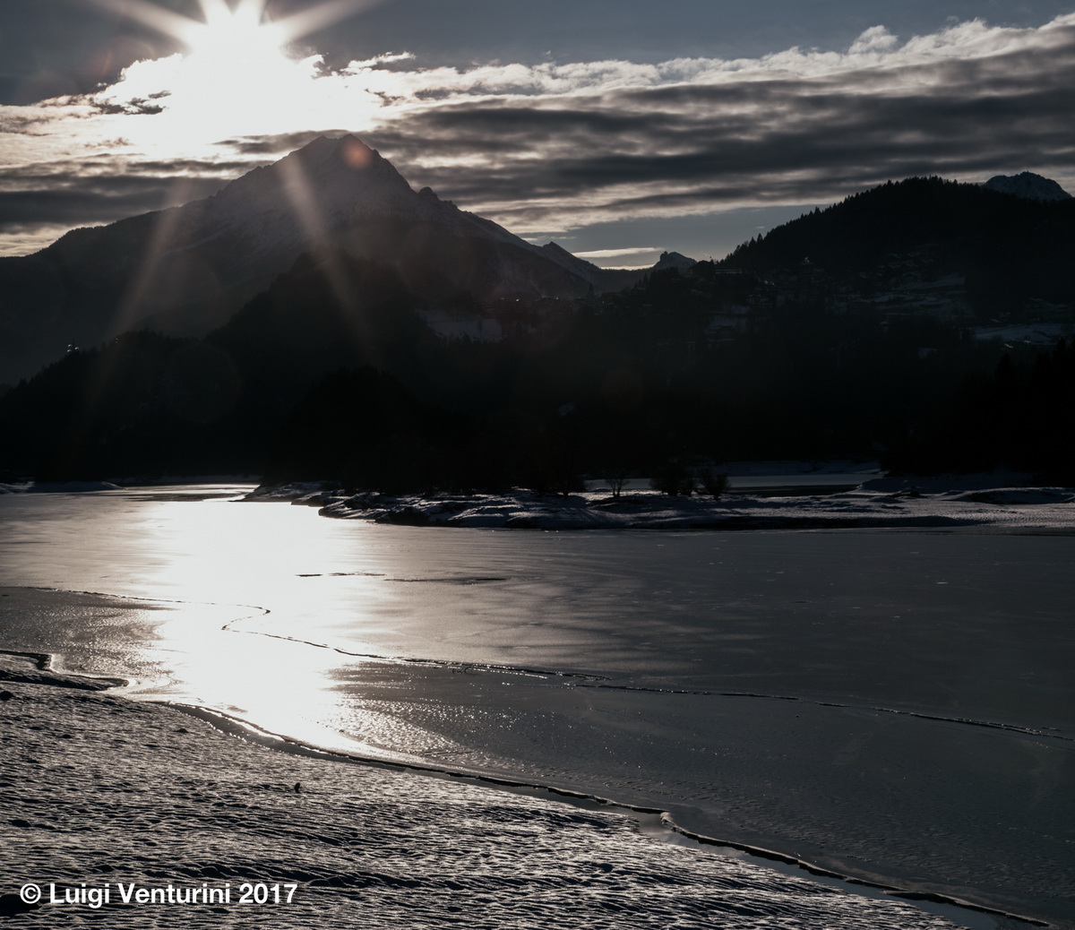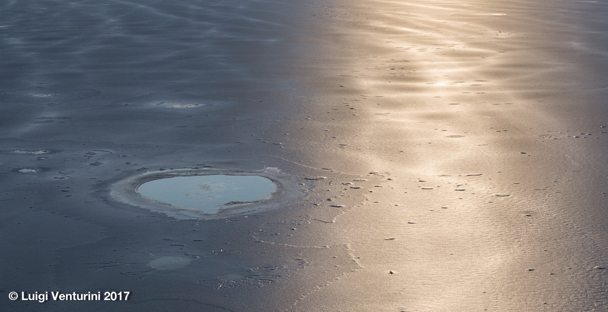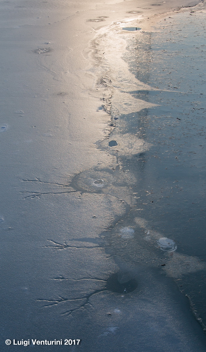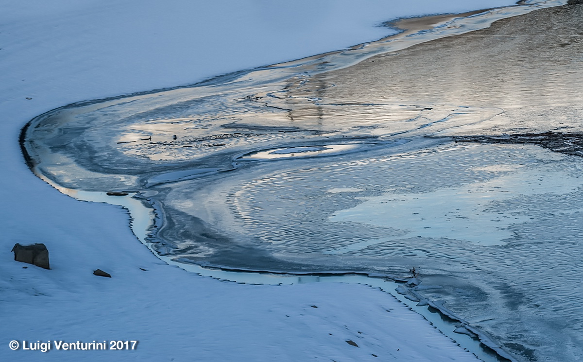 Il lago infatti per tutto l’inverno si copre di ghiaccio ed il Piave, scorrendovi sotto, crea sulla superfice crepe, crateri, onde che poi ghiacciano, e suoni affascinanti ed un po’ inquietanti.