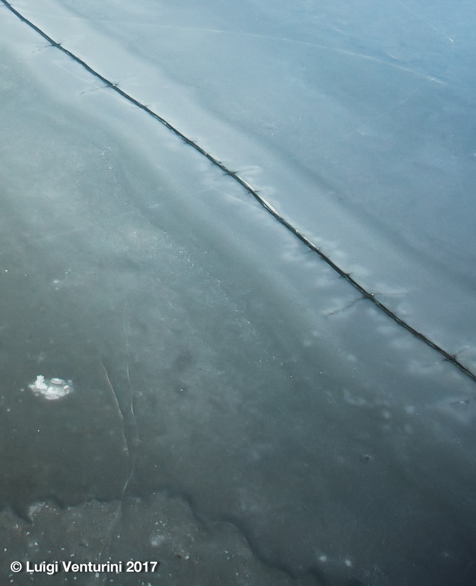 Le linee elettriche ad alta tensione che affiancano il lago generano un crepitio fastidioso che dopo un po’ le nostre orecchie non sentono più, si abituano e l’ignorano, ma il ghiaccio emette suoni cupi a bassa frequenza che sentiamo quasi più con lo stomaco che con le orecchie.
